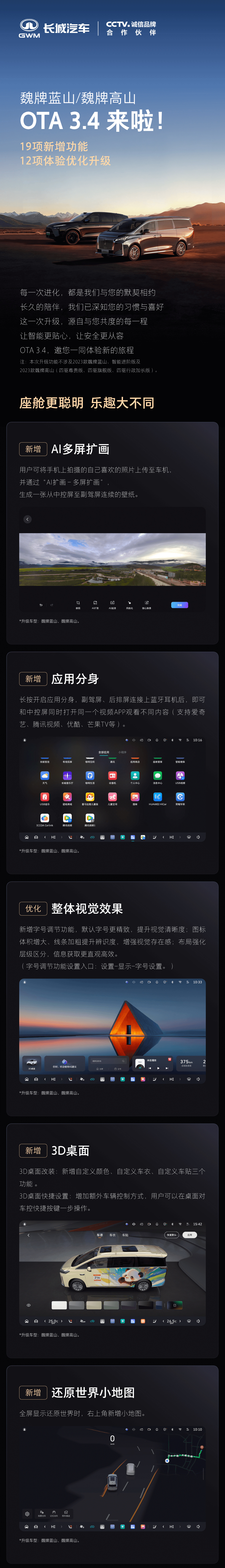 需要注意的是,本次升级即日起分批推送,预计 7 个工作日内全部车主推送完成。当前版本必须为 OTA3.3 版本,才可升级 OTA3.4 版本。魏牌蓝山安装约 55 分钟,魏牌高山安装约 60 分钟。