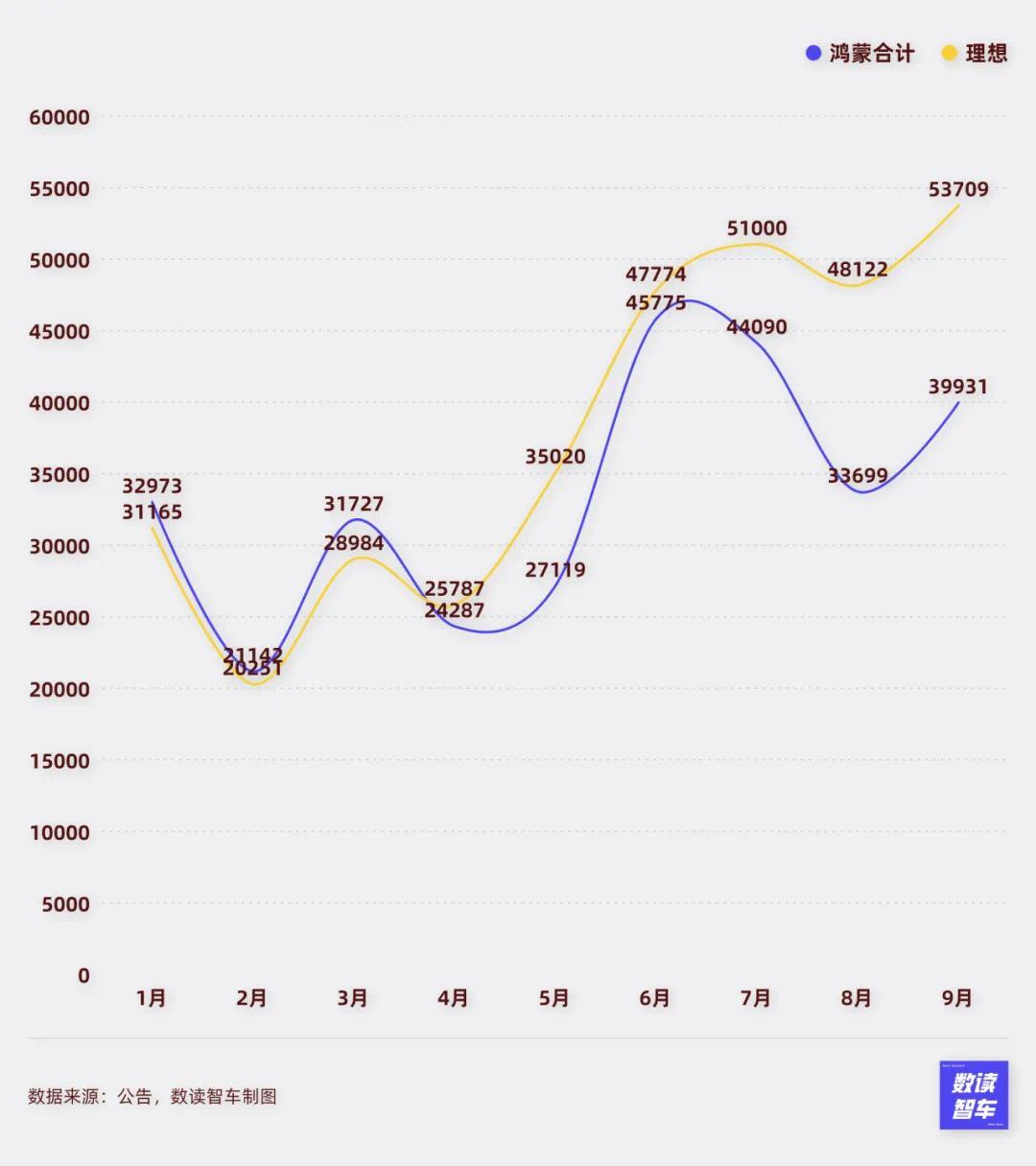 理想依然保持着对华为鸿蒙智行的领先,从4月开始,理想再也没有让鸿蒙智行反超。鸿蒙智行已经推出了问界、智界、享界三个品牌6款车型,但三个品牌联合起来也不如理想的销量。