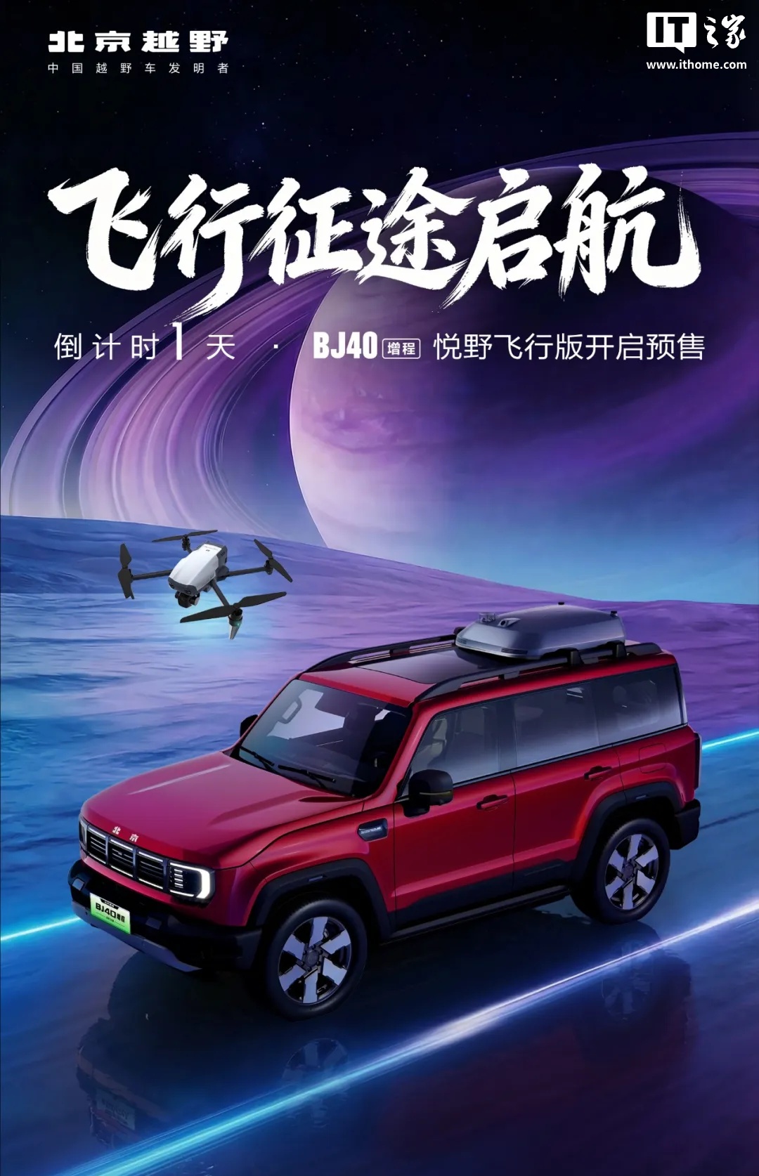 IT之家注意到,北京越野 BJ40 增程悦野飞行版汽车的预热海报显示,该车车顶配备车顶无人机收纳舱,预计将提供车载无人机。官方预热信息显示: