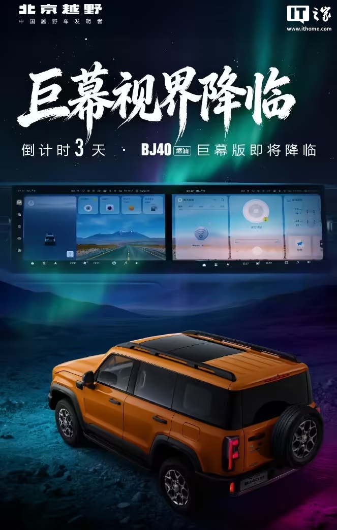 《北京越野 BJ40 燃油巨幕版 1 月 27 日上市,搭载更大尺寸中控屏》