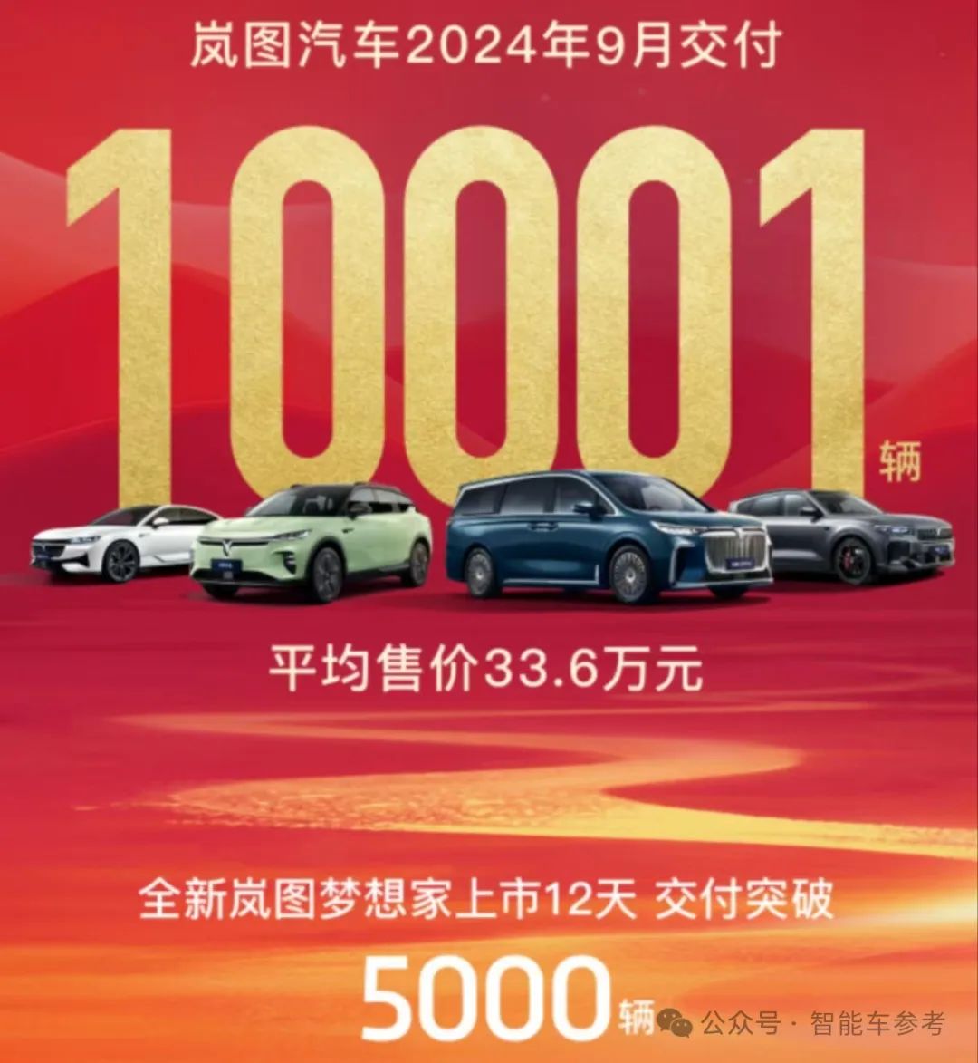 东风旗下的岚图9月交付量也破万了,其中一半来自新款梦想家,品牌平均售价达到了33.6万元。