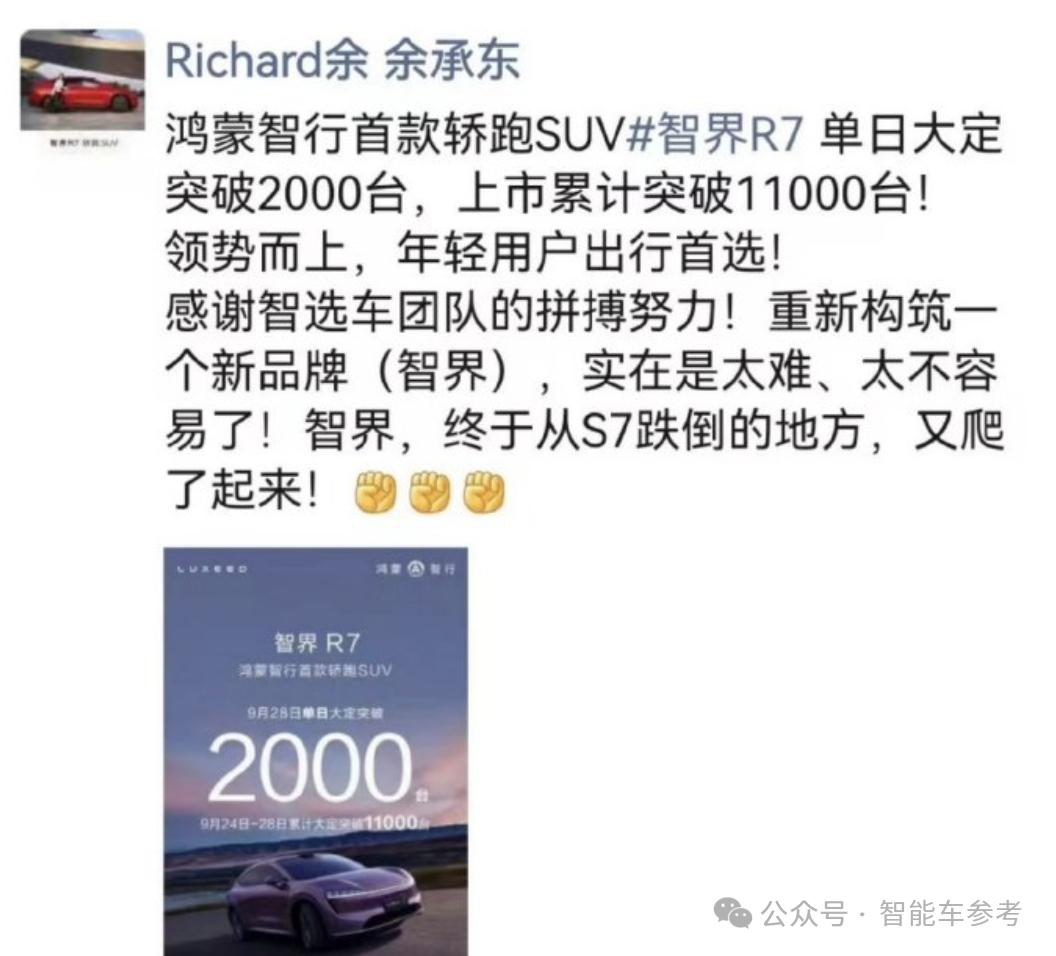 对于R7的上市表现,近期余承东发朋友圈感慨:
