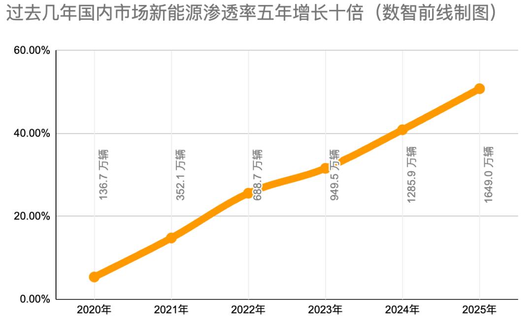 中国汽车产业的新能源渗透率在这一时间段实现了五年十倍的大跃迁,从2020年的5.4%到2025年的54%,同期,全国新能源产量从137万辆增至总量超1600万辆,中国新能源汽车渗透率在过去五年实现了从“边缘”到“主流”的转变。