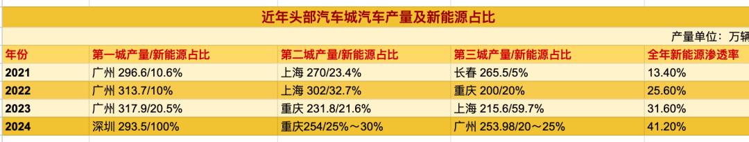 从过去三年最大的黑马城市和最亟需转型城市的命运沉浮里能验证上述观察。比如广州,从2022年开始新能源布局不足带来的危机已然显现。当时全国的新能源渗透率已经超过了25.6%,但广州直到2023年才刚刚超过20%,明显落后于全国水平,也落后于当年的第二名城市重庆和位居第三名的深圳。