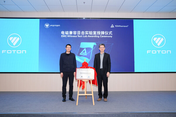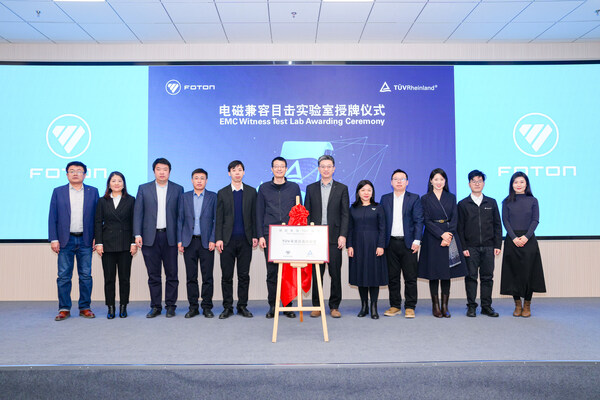 北京2026年1月28日 /美通社/ -- 1月23日,国际独立第三方检测、检验和认证机构德国莱茵TÜV大中华区(以下简称"TÜV莱茵")与北汽福田汽车股份有限公司(以下简称"北汽福田")举行电磁兼容目击实验室授牌仪式,标志着北汽福田试验中心电磁兼容实验室正式获得E-mark认证TÜV莱茵目击实验室资质。北汽福田业务副总裁、海外事业部总裁付军,工程研究总院常务副院长郭凤刚、海外事业部研发副总裁王秋香,TÜV莱茵大中华区交通服务高级副总裁黄余欣、销售总经理李卫英等双方代表出席了授牌仪式。