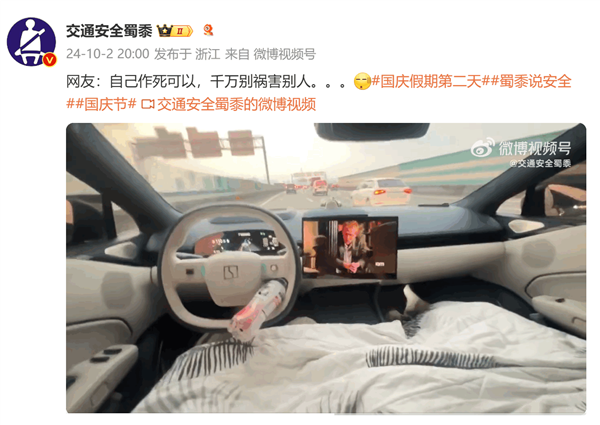 而他和副驾人员,一起躺在前排,更离谱的是,两人盖起了被子睡觉,全程让车辆自动驾驶。