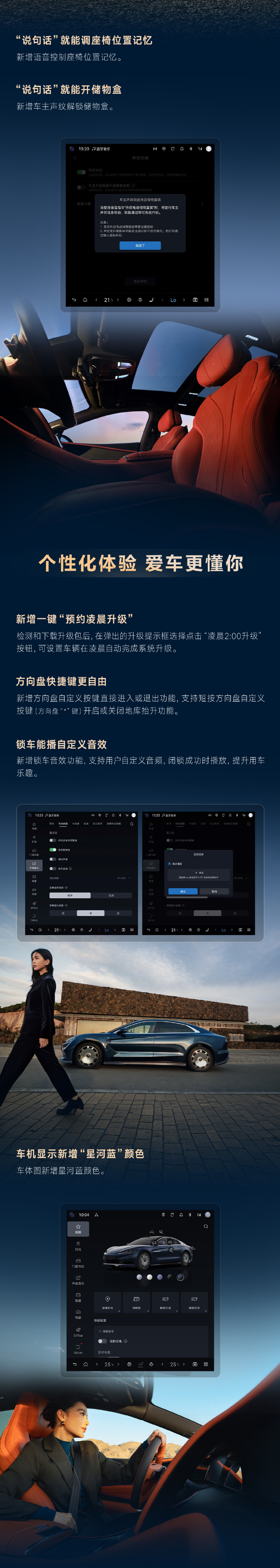 此外,更新还包含方向盘自定义按键触发地库抬升、锁车自定义音效、充电预热(纯电车型)等细节优化。系统支持预约凌晨自动升级,以减少用车时段更新干扰。