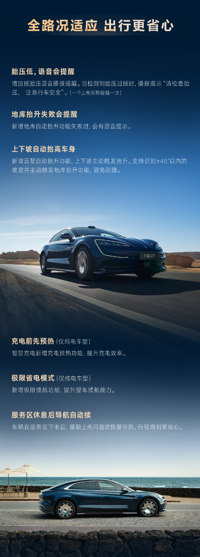 新增云辇自动抬升功能,上下坡主动触发抬升。支持识别 ±45° 以内的坡度并主动触发地库抬升功能,避免剐蹭。