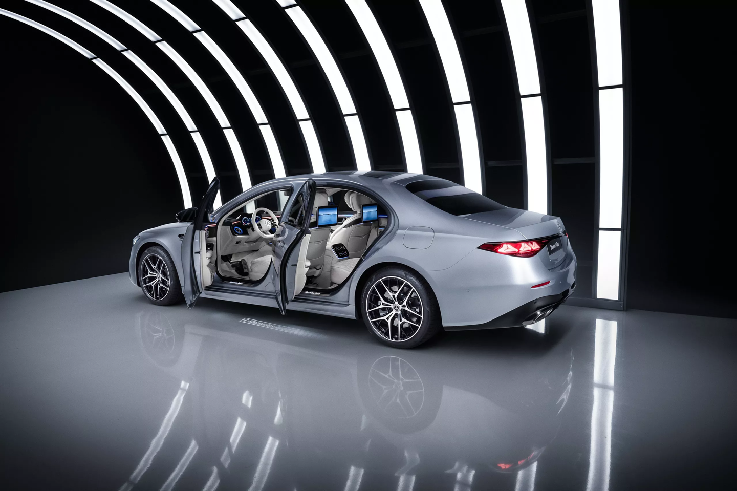 相比外观的小幅进化,座舱变化堪称脱胎换骨。以往的木饰板让位于密集屏幕布局,包含 12.3 英寸仪表、14.4 英寸中控屏,以及 12.3 英寸副驾屏。为了适配这些屏幕,奔驰重新设计了仪表台与中控区域,新增双无线充电与发光杯架区域。