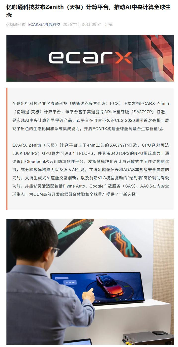 IT之家 1 月 30 日消息,今日,亿咖通科技正式发布 ECARX·Zenith(亿咖通 · 天极)计算平台,该平台基于高通骁龙 ®Ride 至尊版(SA8797P)打造,号称是“实现 AI 中央计算的里程碑产品”,该平台在收官不久的 CES 2026 期间首次亮相。