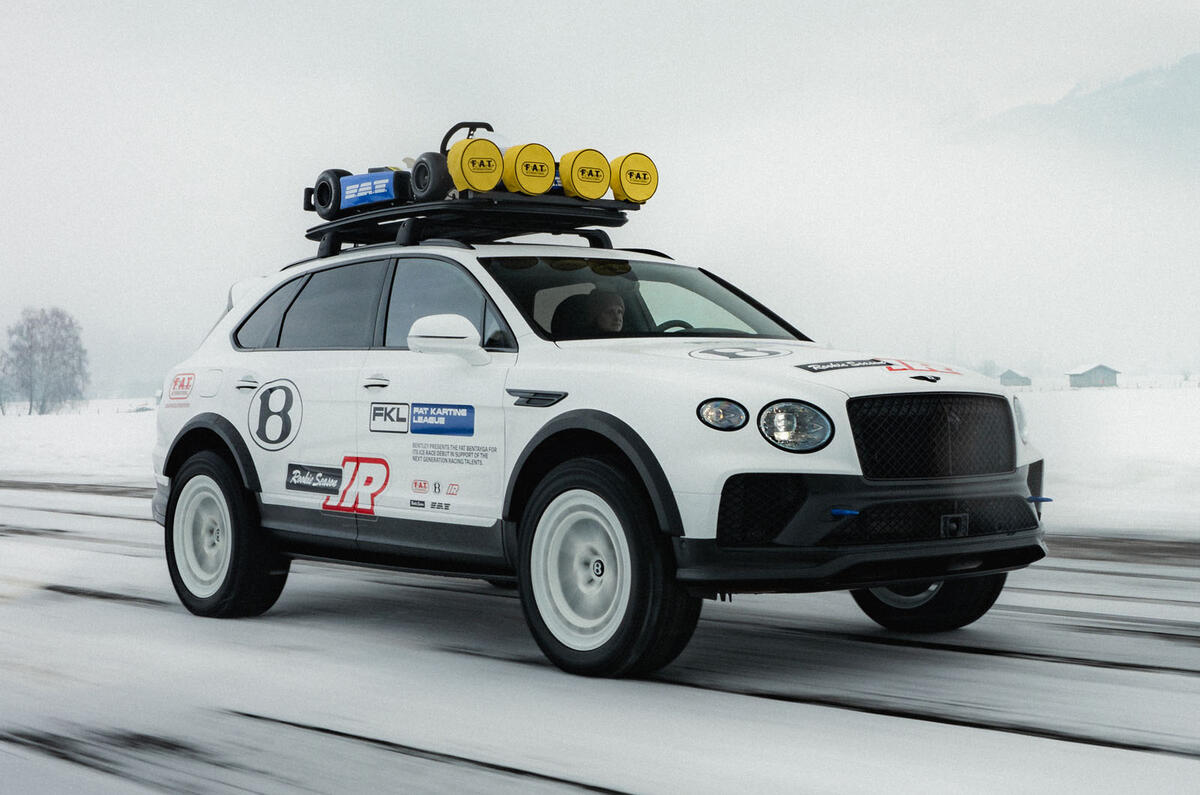 外观上,宾利还增加了车顶储物舱,内含一辆电动卡丁车,并配有四盏超大探照灯、双拖车钩,采用高山白涂装与白色轮圈,整体更有探险装备感。
