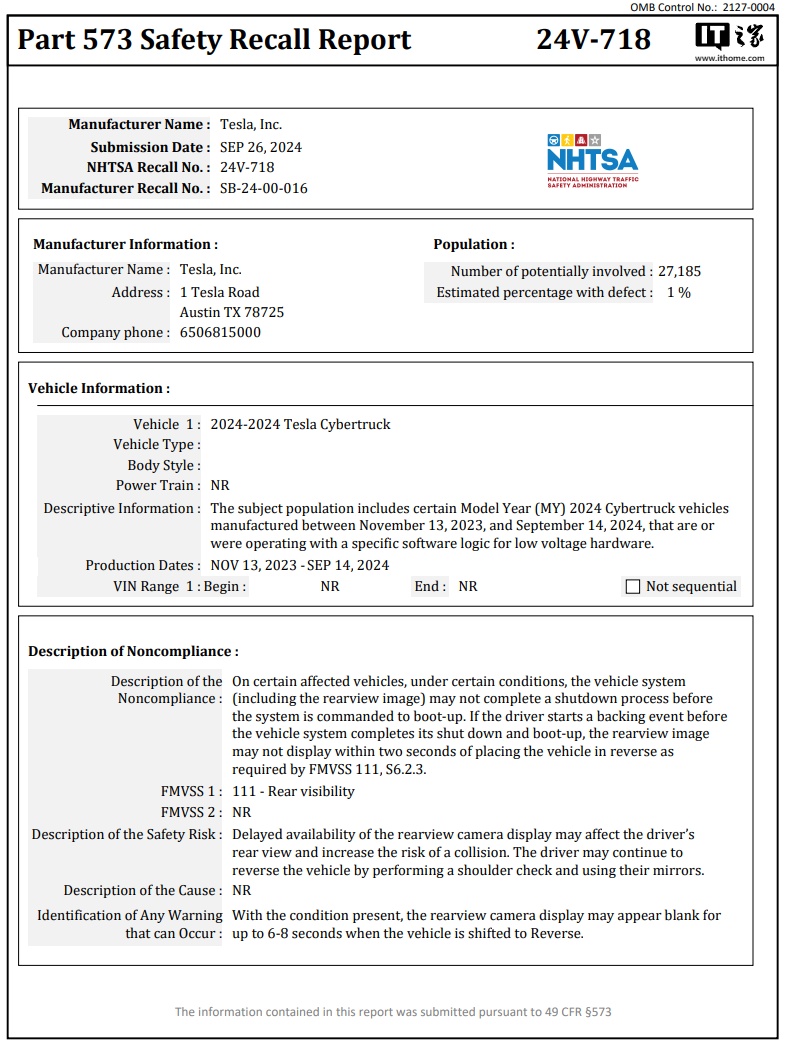 IT之家 10 月 3 日消息,特斯拉向美国国家公路和交通安全管理局(NHTSA)申请召回包括 27,185 辆 2024 款 Cybertruck。
