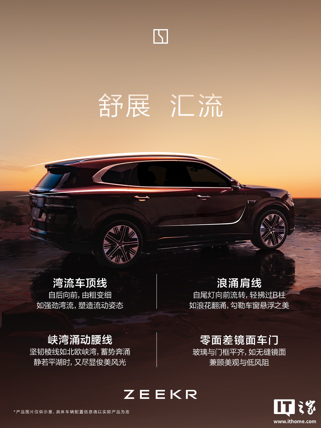 IT之家注意到,极氪 8X 还配备零面差镜车门,玻璃与门框平齐,兼顾美观与风阻。新车湾流车顶线自后向前、由粗变细,塑造了流动姿态;浪涌肩线自尾灯向前流转,可勾勒车窗悬浮之感。