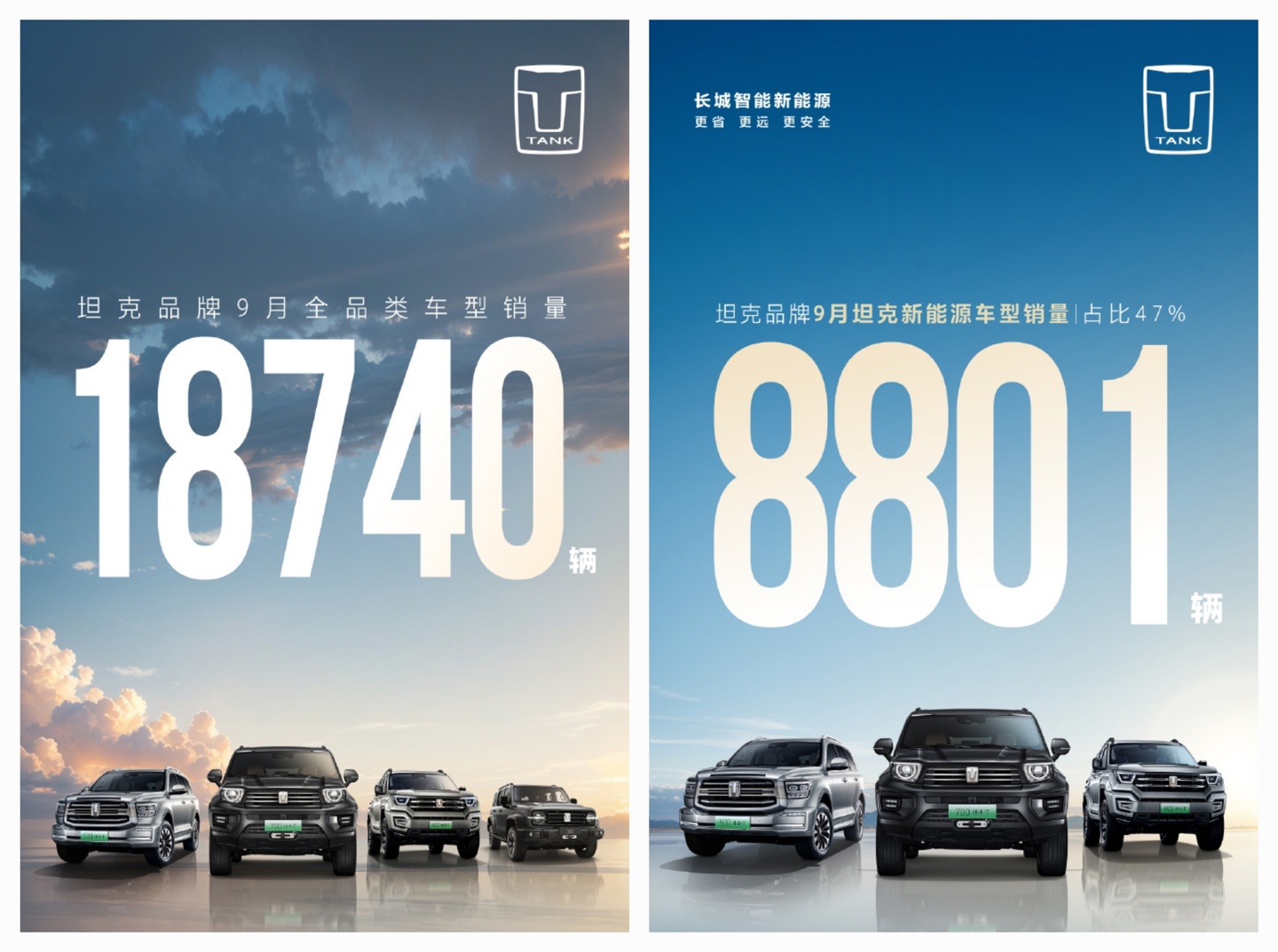 IT之家 10 月 4 日消息,长城旗下坦克 SUV 公布 9 月全品类车型销量 18740 台,环比上升 15%。其中,新能源车型销量 8801 台,占比达 47%。此外,官方还宣布坦克品牌连续 45 月蝉联中国越野销量第一。