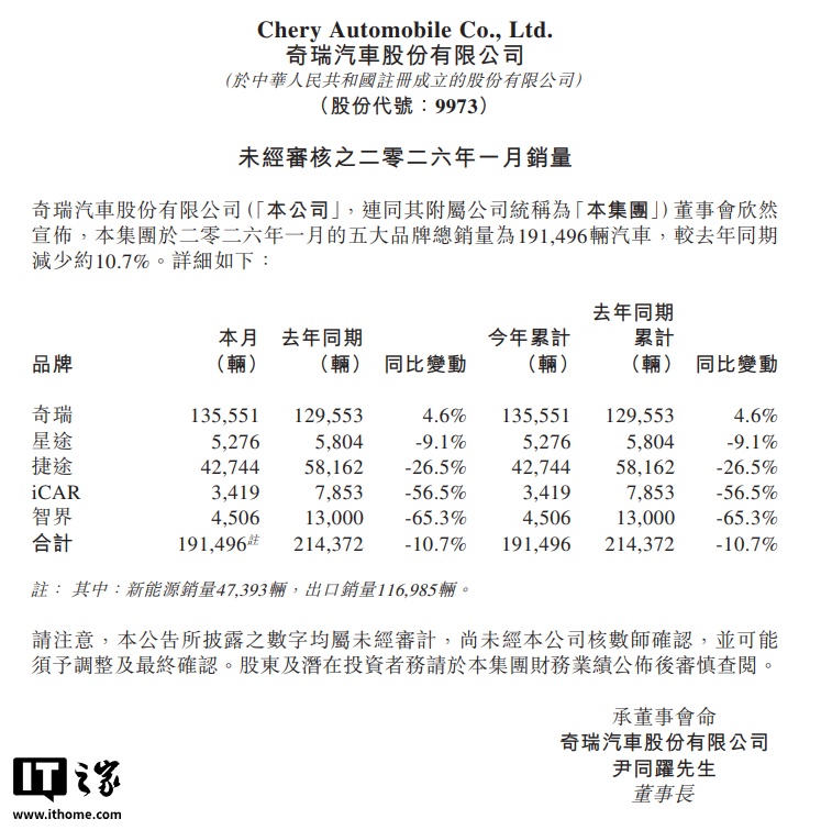 IT之家查询获悉,奇瑞集团 2025 年 1 月份销量达到了 224323 台,以此计算 2026 年 1 月销量同比下滑 10.72%。