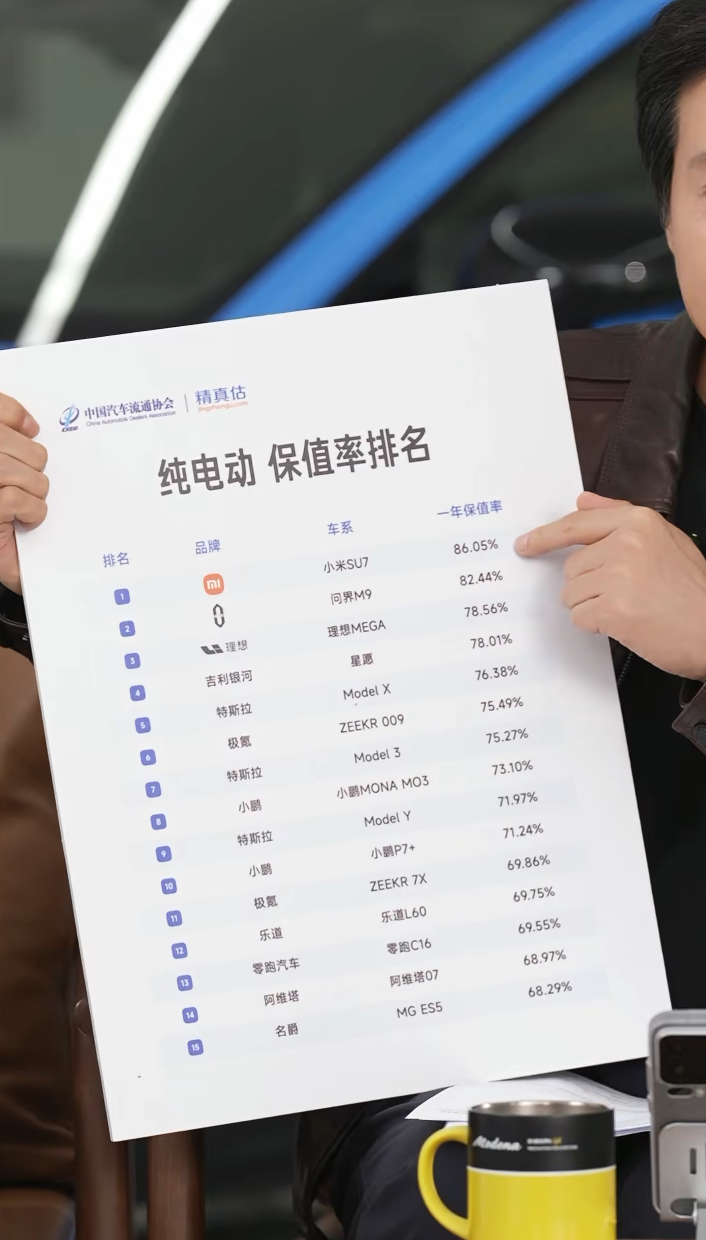 雷军对此拿出了中国汽车流通协会和精真估联合发布的“2025 年度中国汽车保值报告”,并解释道: