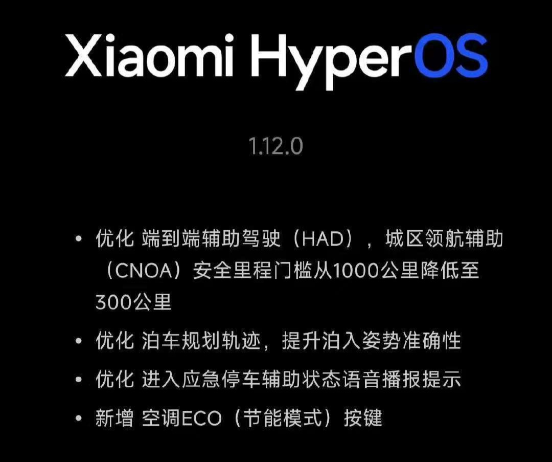 雷军还表示,小米澎湃 OS 1.12.0 版本预计一两天内就会推送,其中 HAD 城市领航辅助功能的门槛从 1000 公里降低到 300 公里,旨在让更多用户能更快体验到全功能智驾。