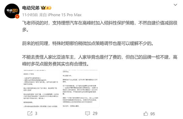 博主“电动兄弟”也表达了类似的观点:支持理想汽车在高峰时加入倾斜性保护策略,不然自建价值减弱很多。