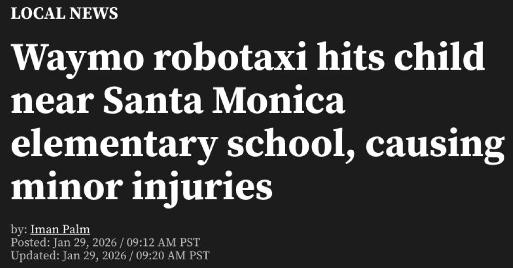 2026年1月23日,外媒报道称,在加利福尼亚州圣莫尼卡一所小学附近,一台直行的Waymo车辆撞上了一名突然冲入车道的儿童,导致儿童受轻伤。