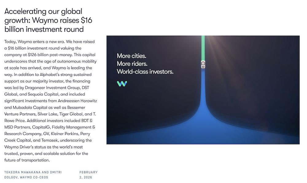 车东西2月3日消息,就在今天,Waymo官宣完成了160亿美元(约合人民币1111亿元)的融资,公司投后估值达到1260亿美元(约合人民币8753亿元)。