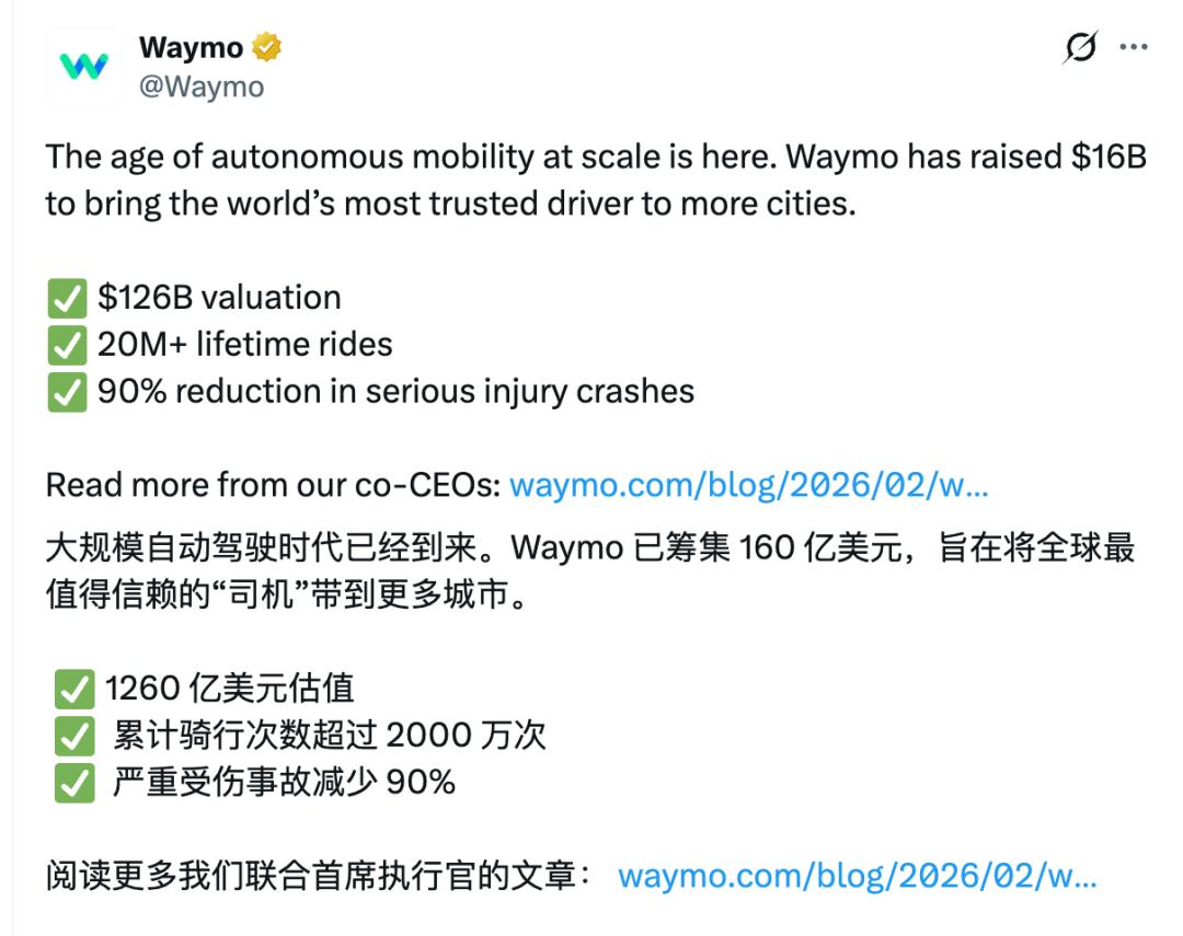 Waymo官宣完成1112亿融资,估值超8760亿元。