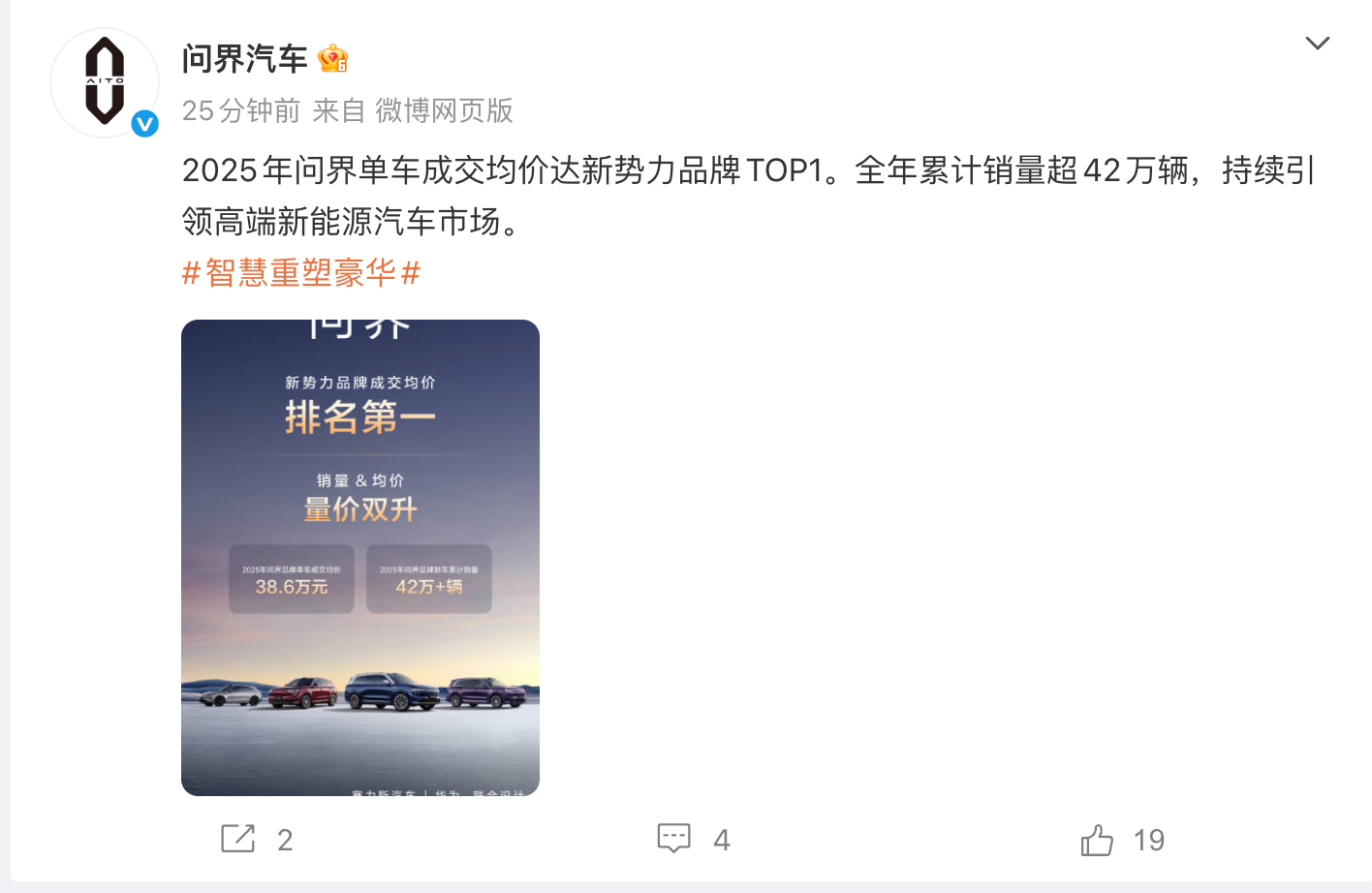 凤凰网科技讯 2月3日,问界汽车官方宣布,2025年问界单车成交均价38.6万元,达新势力品牌TOP1,同时全年累计销量超42万辆。