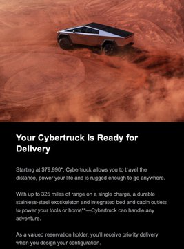 IT之家 10 月 4 日消息,特斯拉已经开始向客户发送邀请,让他们订购售价 79,990 美元(不含选配)的非 Foundation Series Cybertruck。虽然截至IT之家撰稿时,特斯拉的 Cybertruck 订单页面仍显示 Foundation Series 车型,但这款纯电动皮卡的标准版车型似乎即将开始生产。