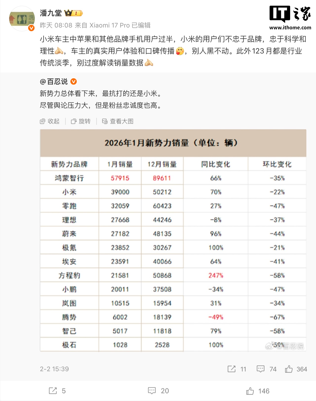 IT之家 2 月 4 日消息,2 月 3 日上午,小米产业投资部合伙人潘九堂发文称:“小米车主中苹果和其他品牌手机用户过半,小米的用户们不忠于品牌,忠于科学和理性。车主的真实用户体验和口碑传播,别人黑不动。此外,1、2、3 月都是行业传统淡季,别过度解读销量数据”。