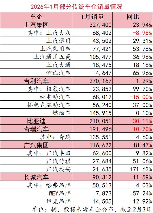 以吉利、上汽、广汽丰田为代表的传统车企,凭借“燃油+新能源”双线布局,在1月交出了最稳健的答卷。