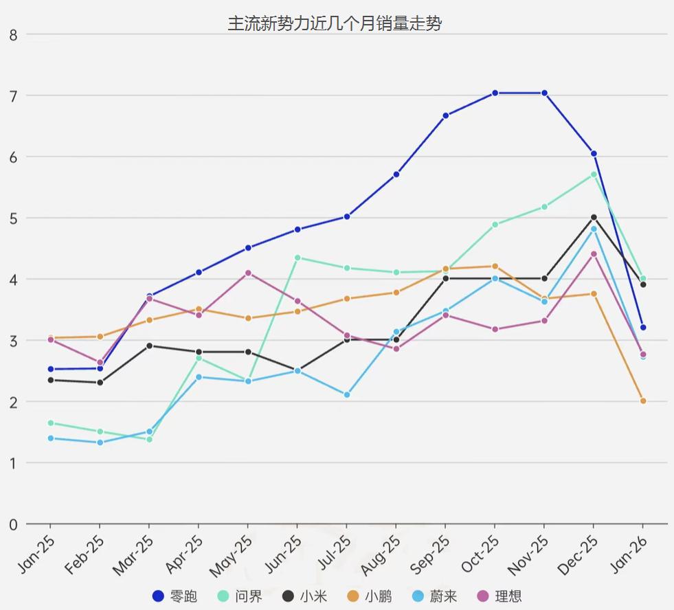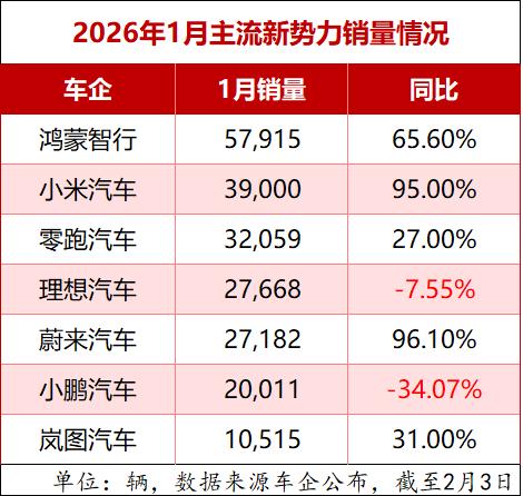 新势力阵营的分化则更为极致。鸿蒙智行(5.79万辆,+65.6%)、小米(3.9万辆,+70%)、零跑(3.21万辆,+27%)、蔚来(2.72万辆,+96.1%)等头部玩家,凭借爆款产品(问界M7/M8、小米YU7、蔚来全新ES8)或低基数效应(极氪去年1月基数不足1.2万辆)实现增长;但理想(2.77万辆,-7.55%)、小鹏(2万辆,-34.07%)等品牌,因前期基数高、新品承接不足,销量同比大幅下滑,陷入“旧款乏力、新款未到”的空窗期。