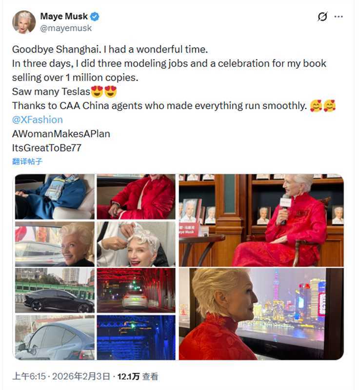 凤凰网科技讯 2月4日,马斯克的母亲梅耶·马斯克昨日在社交平台发文,分享自己结束上海旅程的心情。她表示,“再见上海,我度过了非常愉快的时光。三天里完成了三个模特工作,还庆祝了我的书销量破百万册,路上看到好多特斯拉。”
