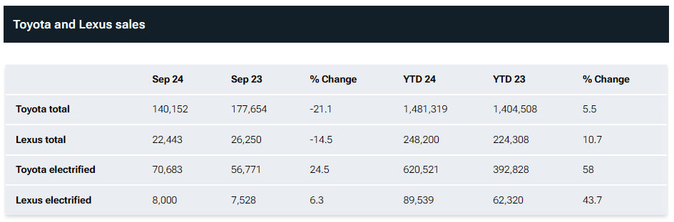 雷克萨斯电动汽车也表现出色,9 月销量同比增长了 25%,超过了品牌整体的 15% 下滑。今年以来,雷克萨斯电动化产品(RX 混合动力、RX 插电式混合动力和纯电动 RZ)的销量同比增长了 44%。