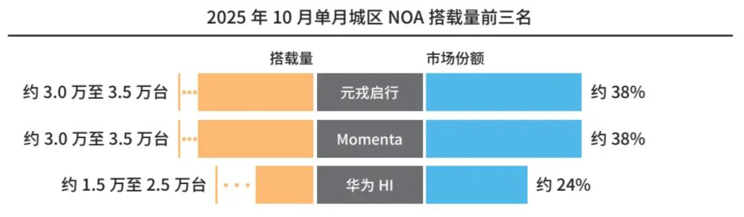 落地重点转向,行业格局也随之大变,出现了头部效应。2025年1月-10月,华为HI(《白皮书》注:指华为在鸿蒙智行“五界”车型之外)、元戎启行、Momenta成为累计城区NOA搭载量前三名,合计拿下市场超九成份额。