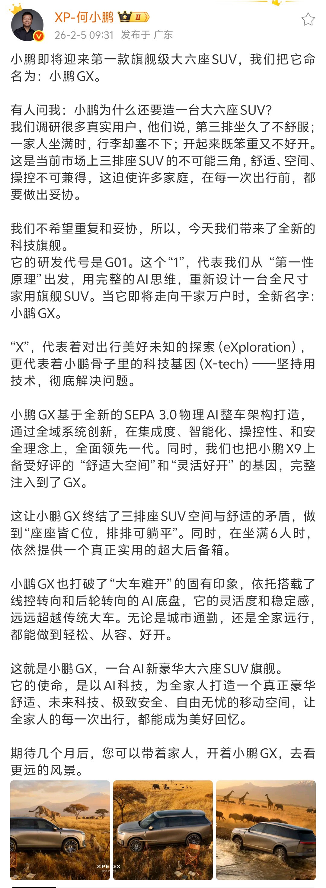 凤凰网科技讯 2月5日,小鹏汽车董事长何小鹏发微博表示,小鹏即将迎来第一款旗舰级大六座SUV,命名为:小鹏GX。