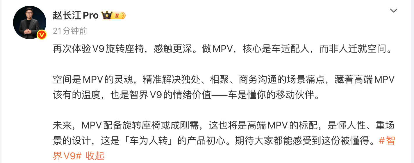 凤凰网科技讯 2月5日,智界汽车执行董事及执行副总裁赵长江谈智界V9内饰空间。他表示,做MPV,核心是车适配人,而非人迁就空间。未来,MPV配备旋转座椅或成刚需,这也将是高端MPV的标配。