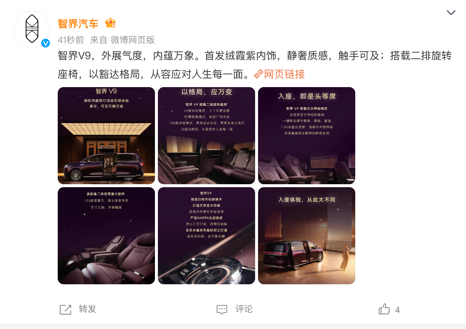 今日,智界汽车官方介绍了智界V9车型的内饰设计。该车首次采用绒霞紫内饰,并可搭配辉光紫外观。
