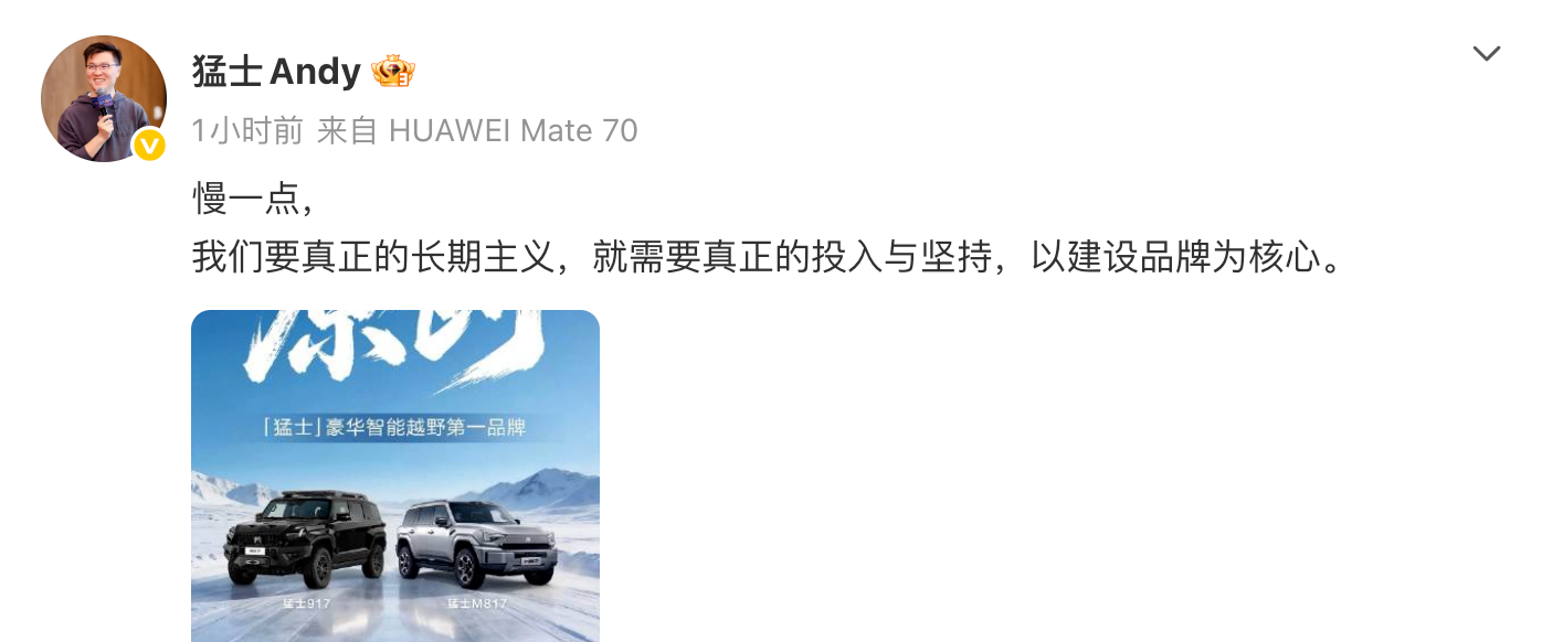 凤凰网科技讯(作者/云飞) 2月5日,东风猛士高管“猛士Andy”发文称,“慢一点,我们要真正的长期主义,就需要真正的投入与坚持,以建设品牌为核心”,并附上一张“请尊重原创”的海报。