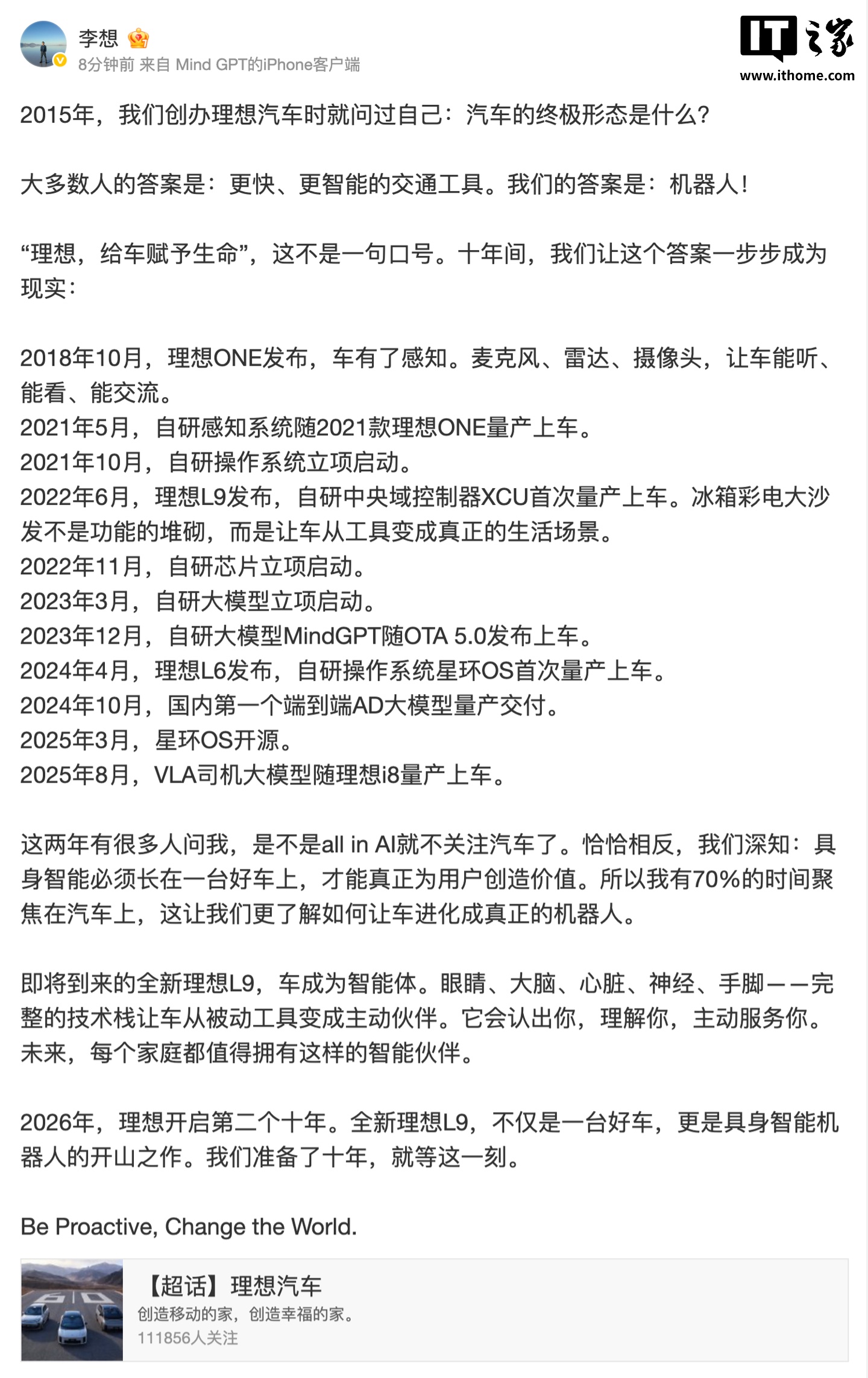 IT之家 2 月 5 日消息,今天下午,理想汽车 CEO 李想在微博发布长文,对全新理想 L9 进行预热。