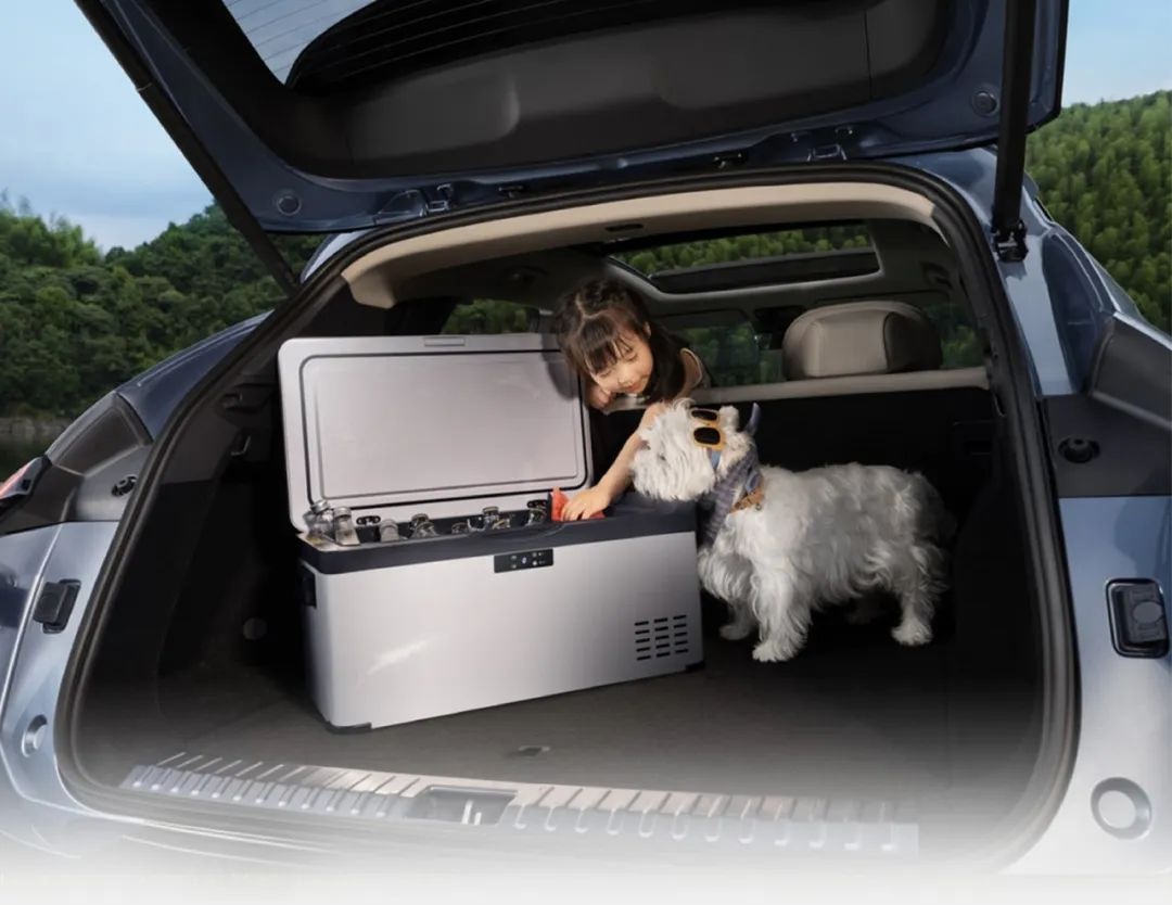 可使用后备箱 12V 电源或 3.3kW 外放电功能,接入电磁炉,吃个火锅,打开车门用哈曼卡顿 23 扬音响播放动听的音乐。