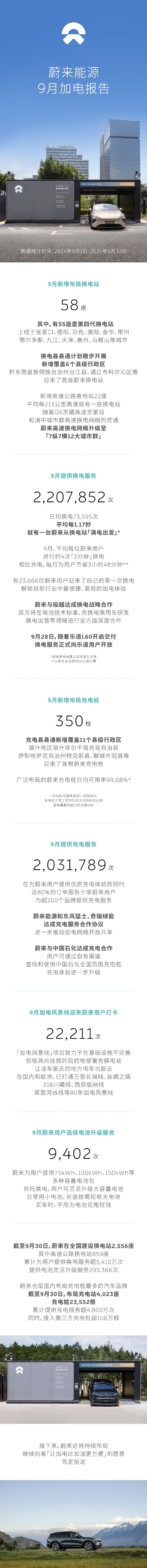 截至 9 月 30 日,蔚来布局充电站 4023 座,充电桩 23552 根,累计提供充电服务超 4800 万次。同时,接入第三方充电桩超 108 万根。