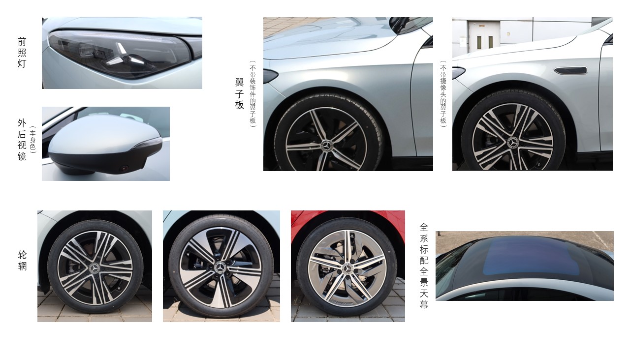 新车长 4776mm,宽 1836mm,高 1471mm,轴距 2830mm,整备质量 1675/1680kg,采用 225/45R18 轮胎、北京奔驰生产的 120/140kW 发动机(1499ml)、亿纬三元锂电池,综合燃料消耗率 4.91L/100km。