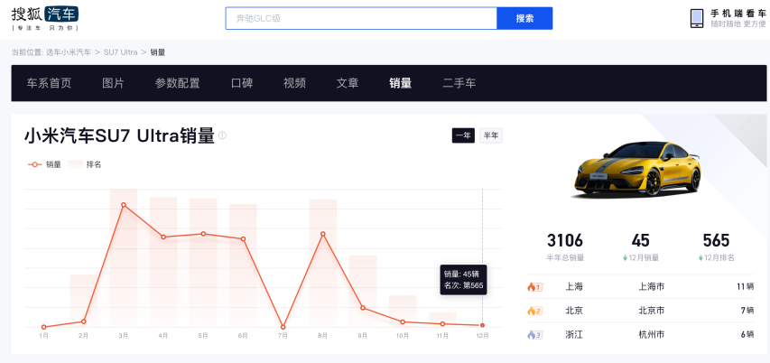 但从去年9月开始,SU7 Ultra的销量骤降至三位数,仅488辆。临近年末的12月,其月销量更是进一步跌至两位数。