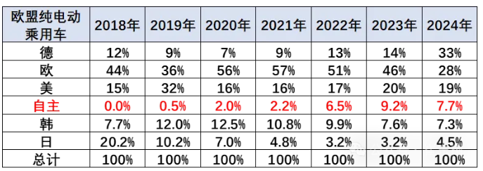 欧盟纯电动车市场中,中国自主品牌份额 2020 年突破了 2%,2021 年达到 2.2% 的水平,2022 年达到 6.5% 的较好状态,2023 年达到 9.2% 的接近于 10% 的水平。在 2024 年受欧盟政策影响就降回到 7.7% 的水平。近几个月的中国自主品牌的纯电动车在欧盟的表现明显下降。