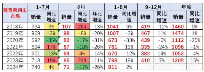 2024 年 1-8 月的欧盟销量达到 811 万台,同比增长 2%,但初步统计的欧盟 8 月的销量仅有 71 万台左右,严重低迷。