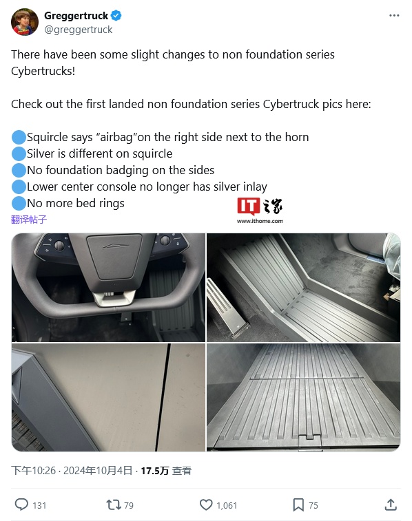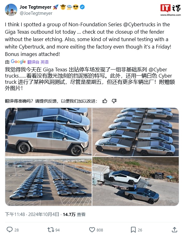 IT之家 10 月 5 日消息,消息源 @greggertruck 昨日(10 月 4 日)在 X 平台发布推文,分享了特斯拉非 Foundation,标准版 Cybertruck 纯电皮卡的照片。