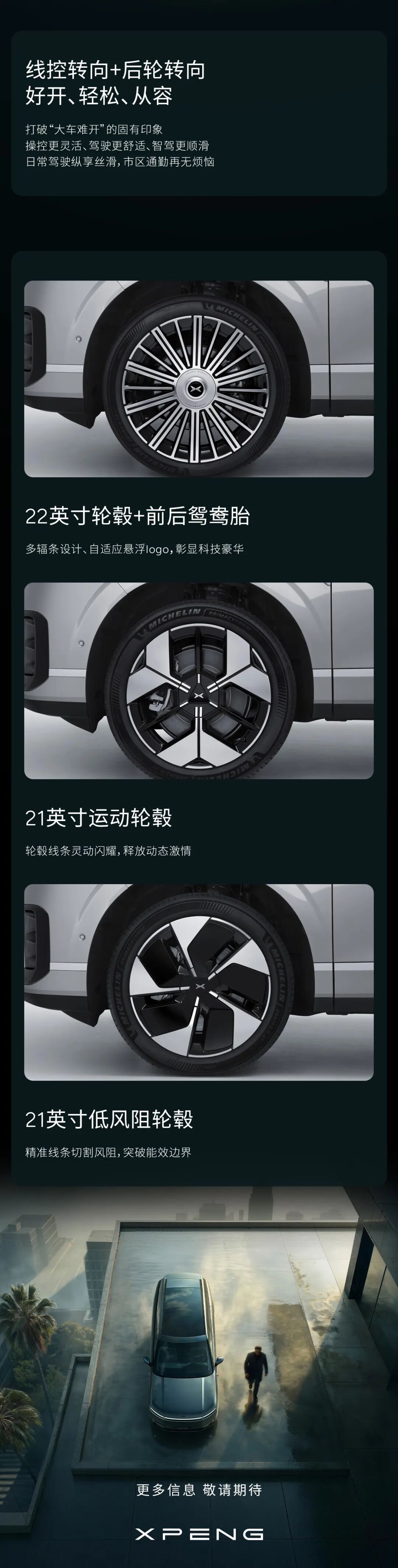 22 英寸轮毂 + 前后鸳鸯胎:多辐条设计、自适应悬浮 Logo;21 英寸运动轮毂、21 英寸低风阻轮毂