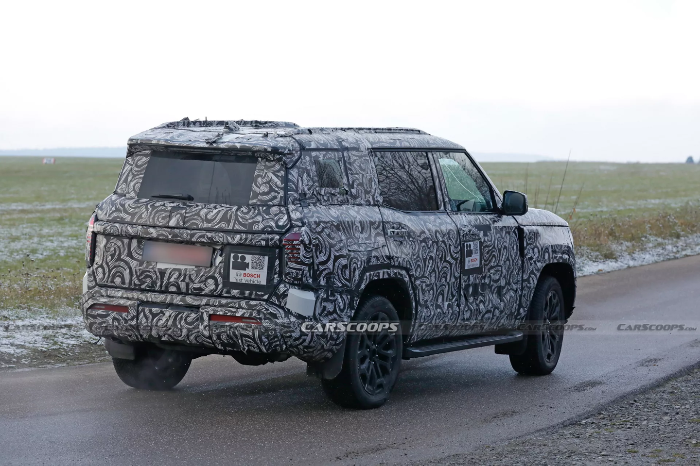 车尾延续硬朗风格,直立后窗、车顶扰流板以及疑似分体式尾门均已显现。部分测试车还配备冬季轮胎和全景天窗,说明车辆正在进行寒区测试,并且高配版本已进入验证阶段。