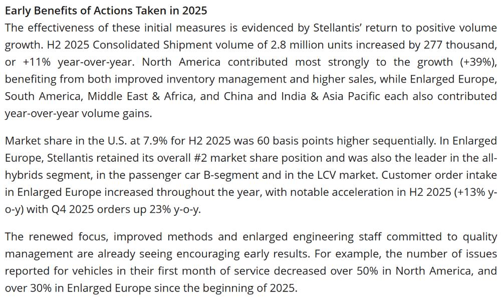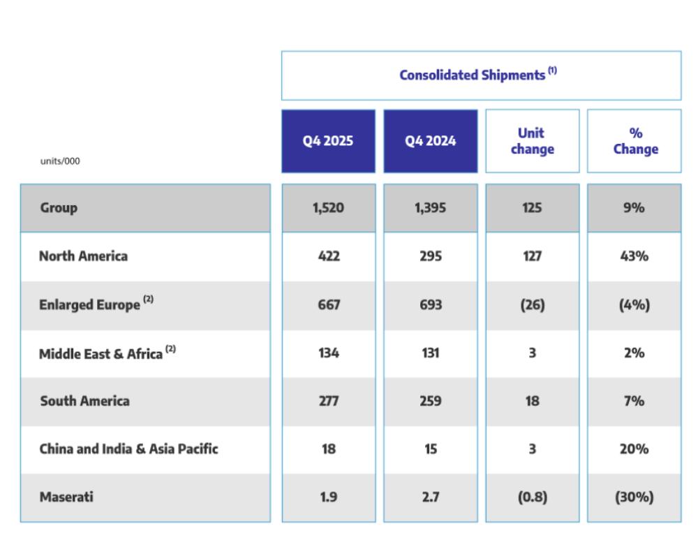 在2025年第四季度,Stellantis集团合并出货量估计为152万辆,同比增长9%,其中北美第四季度出货量较2024年同期增长约12.7万辆,同比增长43%。