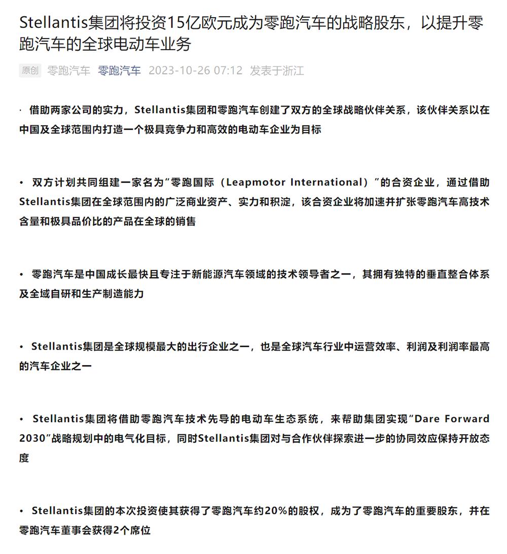 另外,虽然Stellantis集团在电动化转型方面遇到了问题,不过Stellantis集团却找到了一位重要的帮手。2023年10月26日,零跑汽车官方宣布,Stellantis集团计划投资15亿欧元(彼时约合人民币116亿元)来获得零跑汽车约20%的股权,将成为零跑汽车的一个重要股东,并在零跑汽车董事会获得2个席位。