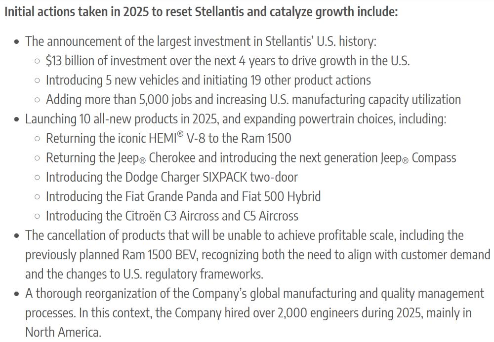 同时,Stellantis在2025年已开始采取行动,主要是调整产品计划和产品组合以符合市场需求。目前Stellantis采取的行动包括进行Stellantis美国历史上最大规模的投资,将在未来4年投资130亿美元(约合人民币900亿元),同时推出5款新车型。